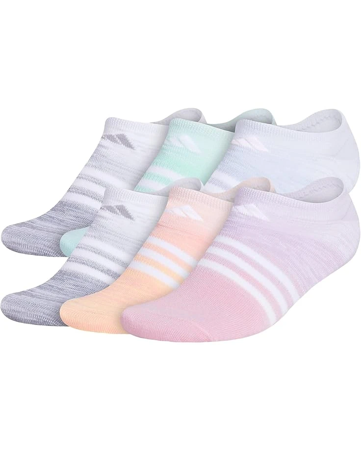 Make your workout sessions extremely comfortable with an elevated style wearing the adidas® Superlite Multi Space Dye 6-Pack No Show Socks.SKU: #9819213Pack of six, gradient-style socks.Pull-on style.No-show length. Soft and stretchable. Moisture-wicking yarn prevents sweat from getting on the feet.Compression of the arch stabilizes and provides additional support.Snug fit with lightweight fibers and a sturdy design.97% polyester, 2% spandex, 1% natural latex rubber.Machine wash, tumble dry.Imported.