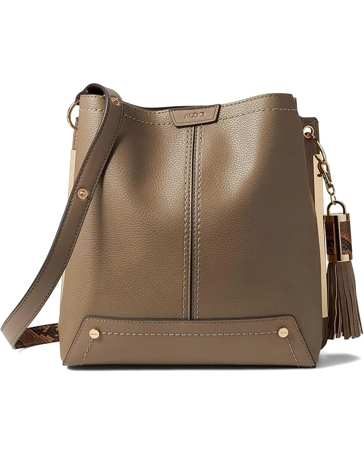 The primary materials that compose this product contain a minimum of 20 percent recycled content.SKU: #9848351Minimalist and modern, the ALDO® Callia bucket bag is your companion for versatile occasions from a semi-formal meet to a short trip to the beach.PU construction.Snap closure to the main compartment.Removable and adjustable crossbody strap.Interior zippered closure.Interior compartments help in segregation.Tassels ornament adorns the side.Goldtone branding on the front bottom.Recycled PU lining.Imported.Measurements: