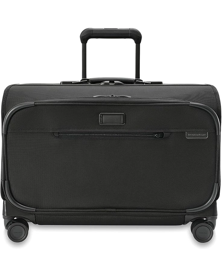 Carry your essentials and keep things sorted for yourself by carrying the Briggs & Riley® Baseline Wide Carry-On Garment Spinner Bag on your next trip.SKU: #9873329Ballistic nylon construction.Zipper closure.Brand logo on front.Spacious and wide center tie down secures your attire by adding compression, reduces shifting while in transit.Removable zip-in extended panel keeps longer garments neat.Door panel features multiple pockets to optimize use of space, adding convenience and organization to your travel.Two corner pouches strategically placed to optimize use of space, can be easily detached for storing accessory items. Outsider® handle provides optimal capacity and a flat packing surface inside to minimize wrinkling.Proprietary shock absorbing spinner wheels offer 360 degree maneuverability and smooth quiet gliding for effortless navigation.Substantial corner-guard protection using impact-resistant material helps protect your luggage, ensuring durability for countless miles.SmartLink™ strap allows for easy transport of two bags as one. Flat packing surface.Ergonomic Outsider® handle gripand cushioned top carry handle for comfort and smooth handling on your travel journeys.Large front pocket for hassle-free access to extra items.SpeedThru™ pocket with orange lining visually informs you that the pocket is opened.Powerpocket conveniently stores battery pack and cell phone for charging on the go.Hide-away ID tag.Garment Bag Hook to hang the bag on a door.Wally clamp securely hangs 1-3 garments in a wrinkle-free way.Interior lining in contrasting color makes finding contents easy.TSA cable combination lock included.Imported.This product may have a manufacturer’s warranty. Please visit the manufacturer’s website or contact us at [email protected] for full manufacturer warranty details.