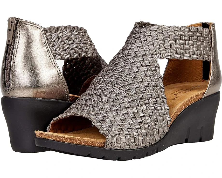 Elevate your warm-weather style with the stylish and comfortable Comfortiva® Alesha.SKU: #9494018Offered in woven elastic or metallic woven elastic.Back zipper for easy on and off.Suede-lined cork comfort footbed with raised PillowTop® memory foam and arch support.Flexible, slip-resistant TPR wedge.Synthetic upper.Suede insole.Rubber outsole.Imported.Product measurements were taken using size 8, width M (B). Please note that measurements may vary by size.Measurements: