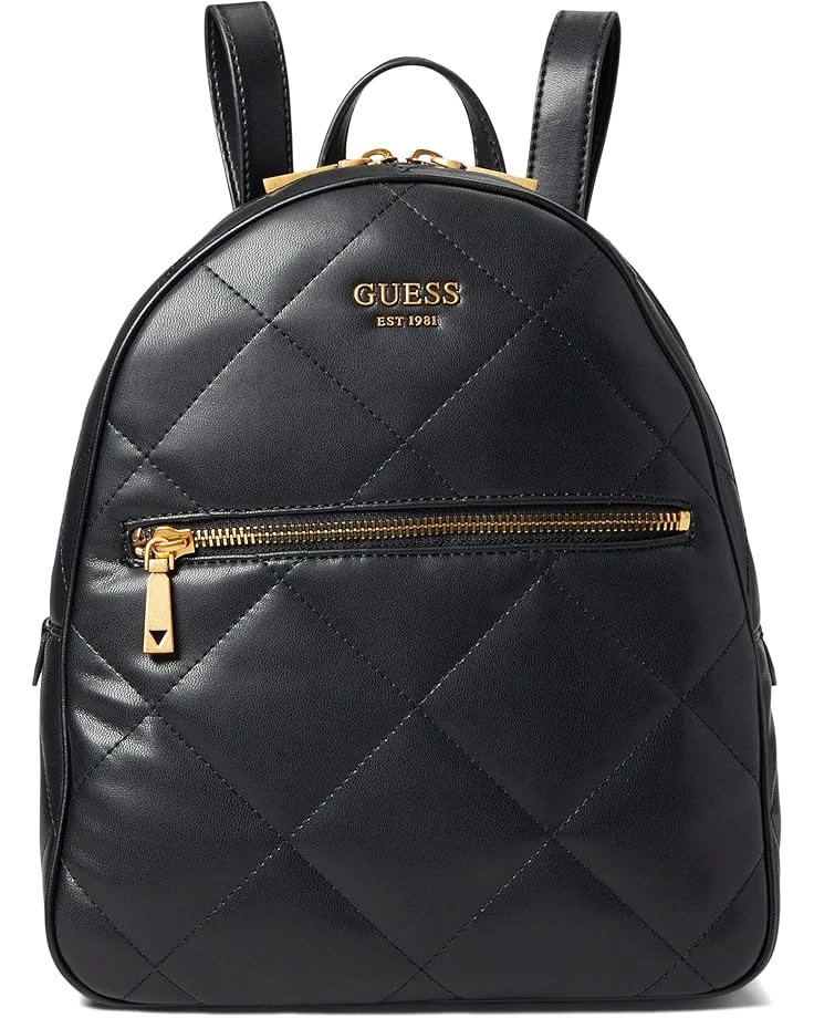 Perfect for travel or just daily use, carry all your daily essentials in style with the GUESS® Vikky Backpack. SKU: #9623956Flat top carry handle and two adjustable shoulder straps. Zippered main compartment. Exterior zippered pocket on front. Interior zippered pocket. Three interior slip pockets. Polyurethane construction with polyester and cotton lining. Imported. Measurements: