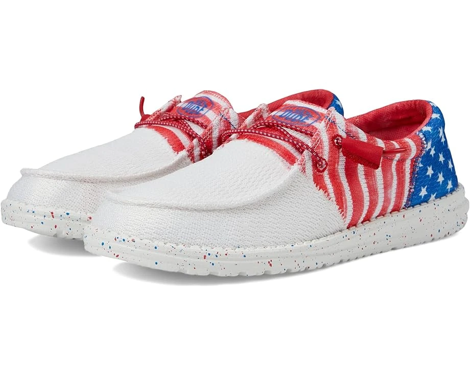 Get your dapper look on wearing the Hey Dude® Wendy Tri Patriotic Loafers.SKU: #9848869Stretch polyester blend upper.Contrasting stretch cotton lining.Leather-lined removable insole.Flex and Fold Technology for added comfort.Lace-up closure.Slip-on style.Contrast-colored stripe detailing on the back.Moc-toe design.Ultralight outsole.Imported.Product measurements were taken using size 9, width M. Please note that measurements may vary by size.Measurements: