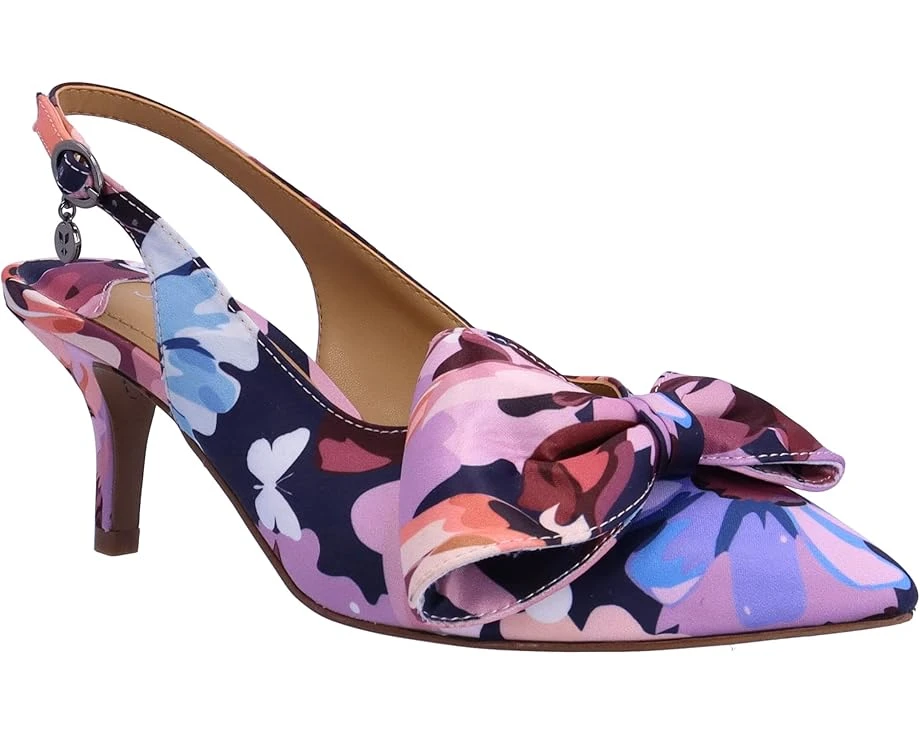 Pointed toe silhouette with bow detailing on it.Low kitten heels.Buckle closure on the ankle strap.Synthetic outsole.Imported.