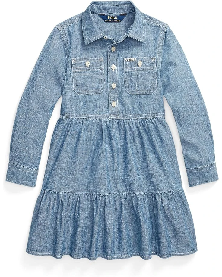 Crafted from a breathable fabric with a modern utility style, the Polo Ralph Lauren® Kids Polo Ralph Lauren® Kids Tiered Chambray Shirtdress adds a dose of elegance and comfort to your little one’s style.SKU: #9836694Point collar and long sleeves with buttoned barrel cuffs.Half buttoned placket.Two buttoned chest pockets.Shirred two-tier skirt.Shirred back yoke.Logo label on the left pocket.Fit-and-flare silhouette.100% cotton.Machine washable.Imported.