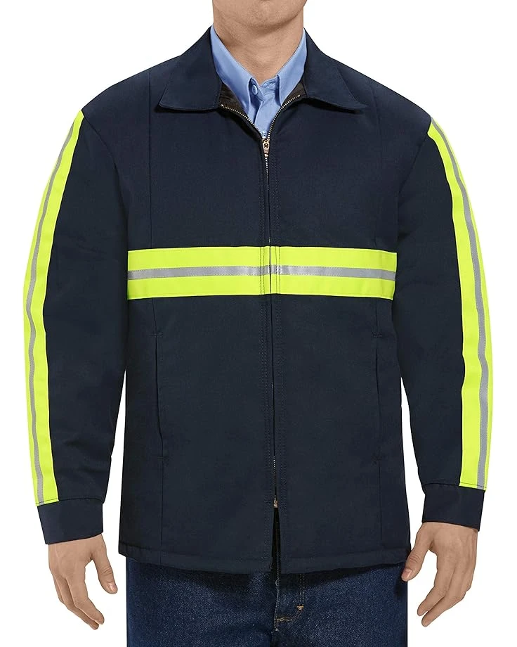 Shell: 65% Polyester , 35% Cotton,Lining: 100% Polyester,Insulation: 100% Polyester *Insulation content may varySKU: #9688183Shell: 65% Polyester, 35% Cotton; Lining: 100% Polyester; Insulation: 100% PolyesterChinaMachine Wash2.5 inch yellow/silver/yellow enhanced visibility trim applied across front chest, down sleeves from shoulder to sleeve ends, and two horizontal stripes across the backPre-cure durable pressSolid brass zipperTwo-piece, topstitched collar, with sewn-in staysTwo lower inset on-seam pockets and utility pocket on left sleeveQuilt lined for comfort and warmth