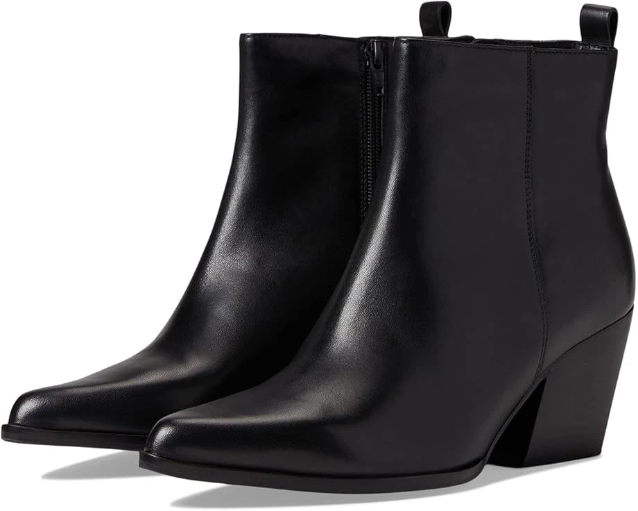 SKU: #9452669Leather upper and insole.Leather and textile lining.Zippered side closure.Pointed toe silhouette.Block heel.Pull tab at the back.Ankle-length boots.Man-made outsole.Imported.Product measurements were taken using size 9, width M. Please note that measurements may vary by size.Measurements: