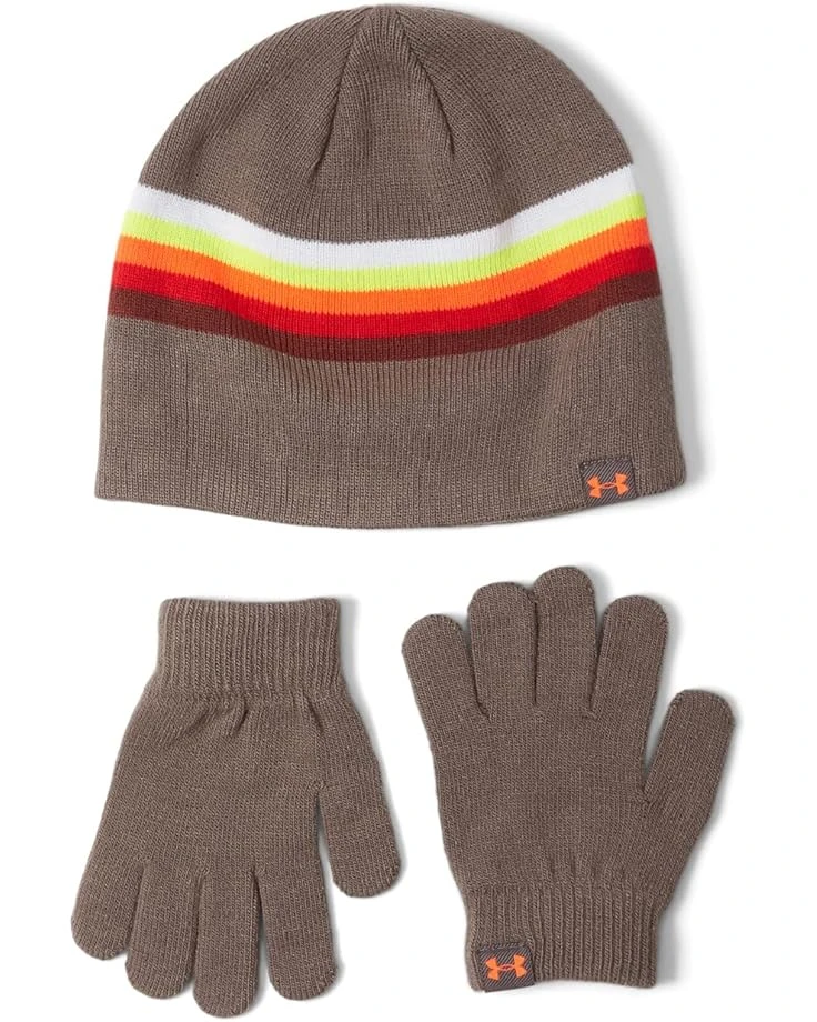 Under Armour® Beanie Gloves Combo (Youth) Hat and Gloves Set is there to keep little hands and heads warm and protected during those cold snaps.SKU: #9227310All Under Armour® Apparel features a tagless design or tear-away tag with no left-over pieces.Beanie and glove set crafted from a midweight, acrylic close knit.Fitted knit beanie in a winter silhouette.Acrylic knit gloves feature a ribbed cuff for a comfortable fit.Logo tags at hems.100% acrylic.Machine wash, tumble dry.Imported.Measurements: